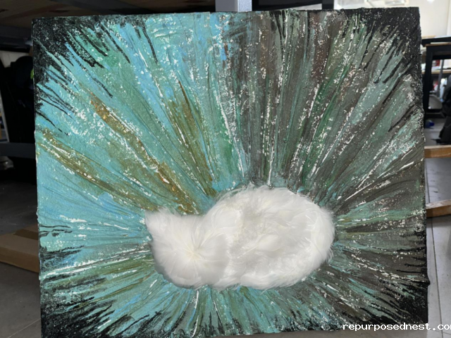 作品介绍:《石英砂-瑞鹤图》—该作品材料以石英砂为主,临摹自宋徽宗的《瑞鹤图》,石青色的天空,云彩对建筑的遮蔽,成群徘徊于上空的仙鹤,将宫殿界画与花鸟结合在一起,具备一种超现实的浪漫。并运用石英砂独特的颗粒感、层次感、立体感,来体现其特殊的画质。