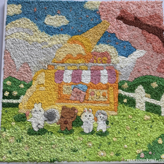 作品介绍:以卡通人物库洛米为主题的创意手工画。它采用纸浆作为主要材料,通过巧妙的手法将纸浆塑造出库洛米的形象。